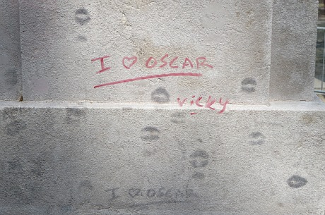 When I last visited Oscar Wilde‘s grave at Pere LaChaise cemetery in ’08 or ’09, his tombstone was covered with dozens (hundreds?) of lipstick kisses. It was a vibrant tribute — an organic, obviously emotional demonstration of fan love. Except Wilde’s heirs and some stuffed-shirt Irish thought the ksses were disrespectful, and so they got together with the French and had them washed off and then had a glass wall erected in front of Wilde’s tomb so no one could plant any more.