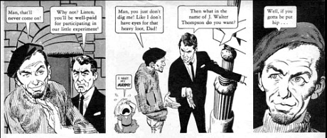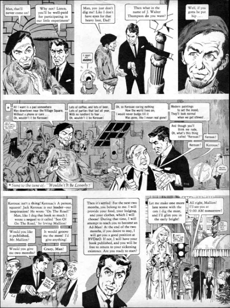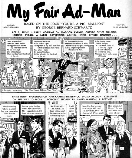 With all the Mad Men hosannahs of the last few years it’s strange that no one has ever recalled that the great Mad magazine ran an amusing musical parody piece in 1960 or thereabouts, right when Don Draper and his Sterling Cooper colleagues were establishing a beachhead. Based on Lerner and Leowe’s My Fair Lady, “My Fair Adman” was a dryly cynical comment about Madison Avenue values in which Cary Grant was more or less Henry Higgins, Charles Laughton played a version of Colonel Pickering and Frank Sinatra was Eliza Doolittle (i.e., “Irving Mallion,” a Greenwich Village beatnik with a beret and a Van Dyke).