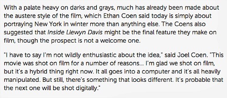 From Brian Brooks’ 9.26 Indiewire account of the Inside Llewyn Davis press conference, held at the New York Film Festival’s press venue, the Walter Reade theatre. Here, by the way, is Marcus Mumford and Oscar Isaac‘s cover of folk classic “Fare Thee Well (Dink’s Song),” which is heard at least a couple of times (thrice?) in the Coen brothers film. We’ll have to wait until 11.12 for the official Davis soundtrack and especially “Please Mr. Kennedy,” which, when performed by Isaac, Justin Timberlake and Adam Driver, is easily the most conventionally entertaining moment in the film.